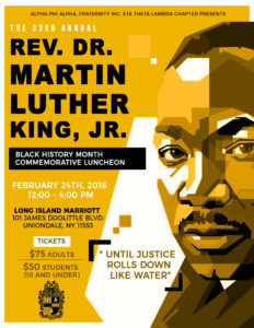 The Eta Theta Lambda chapter 33rd Annual Martin Luther King Jr. Commemorative Luncheon will be held on February 24th, 2018 from 12-4 PM at the Long Island Marriott.